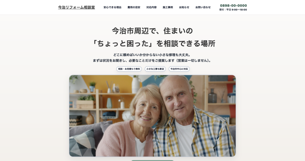 今治市周辺で、住まいの小さな困りごとを気軽に相談できるリフォーム相談窓口を想定したWebサイトです。